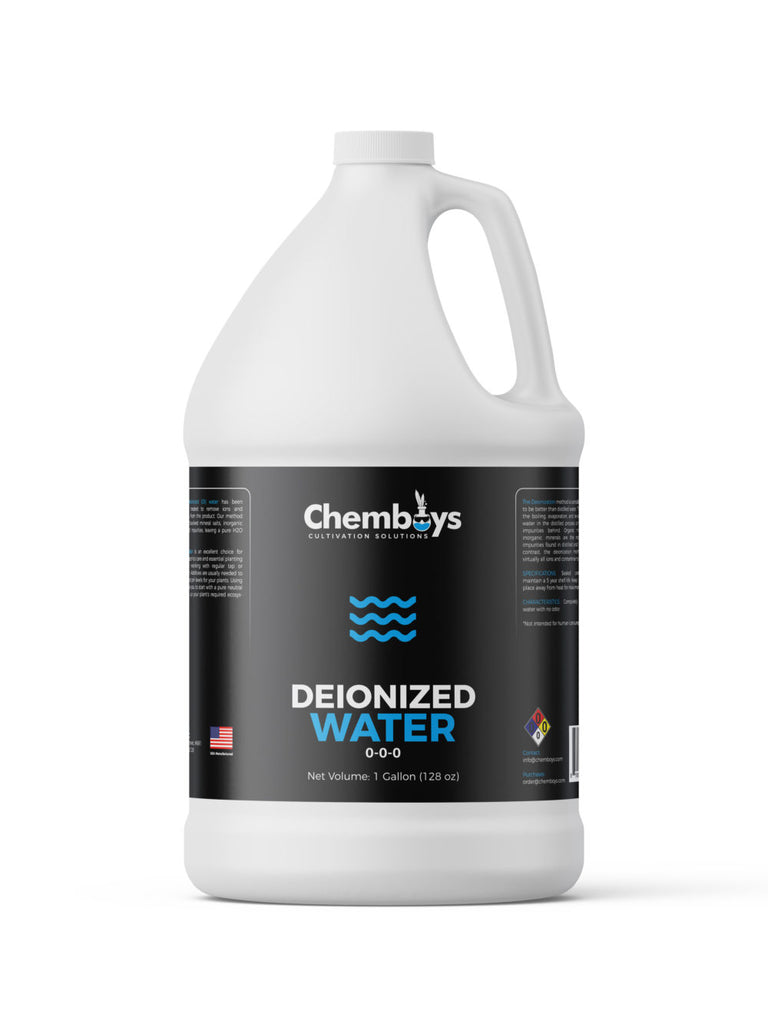 Chemboys Deionized (DI) water has been filtered and treated to remove virtually all ions and contaminants. NO dissolved mineral salts, inorganic materials, and impurities. When working with tap or distilled water, you usually need additives to achieve desired levels for your plants. Using DI water helps you to start with a pure base to build a plant’s required ecosystem.