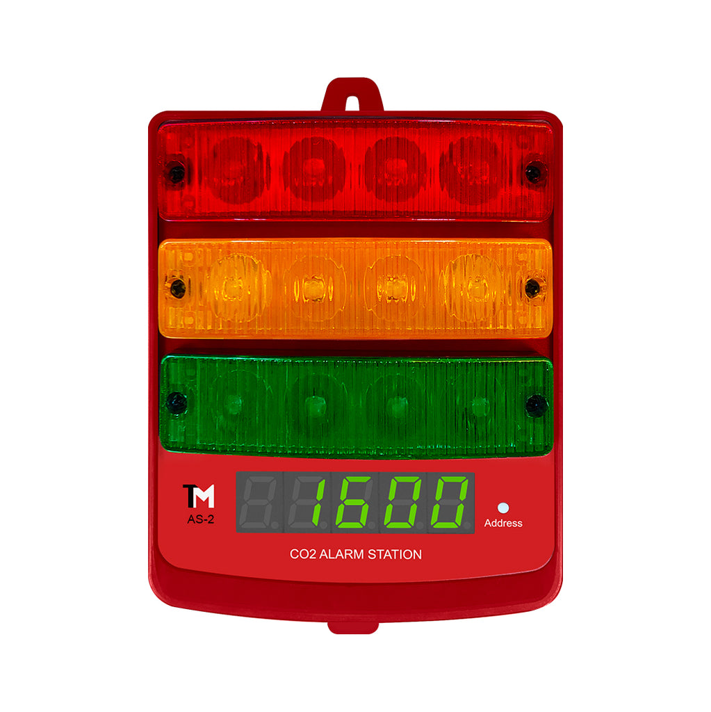 The AS-2 CO2 Alarm Station combines an audio-visual alarm module with a color-coded LED display indicator and a LCD digital ppm level reading. It is designed to be mounted outside of the space to be monitored, and will display the CO2 ppm level. The DSA-1 can be linked to either the low or the high level CO2 sensors, or it can linked to both sensors for complete redundancy.