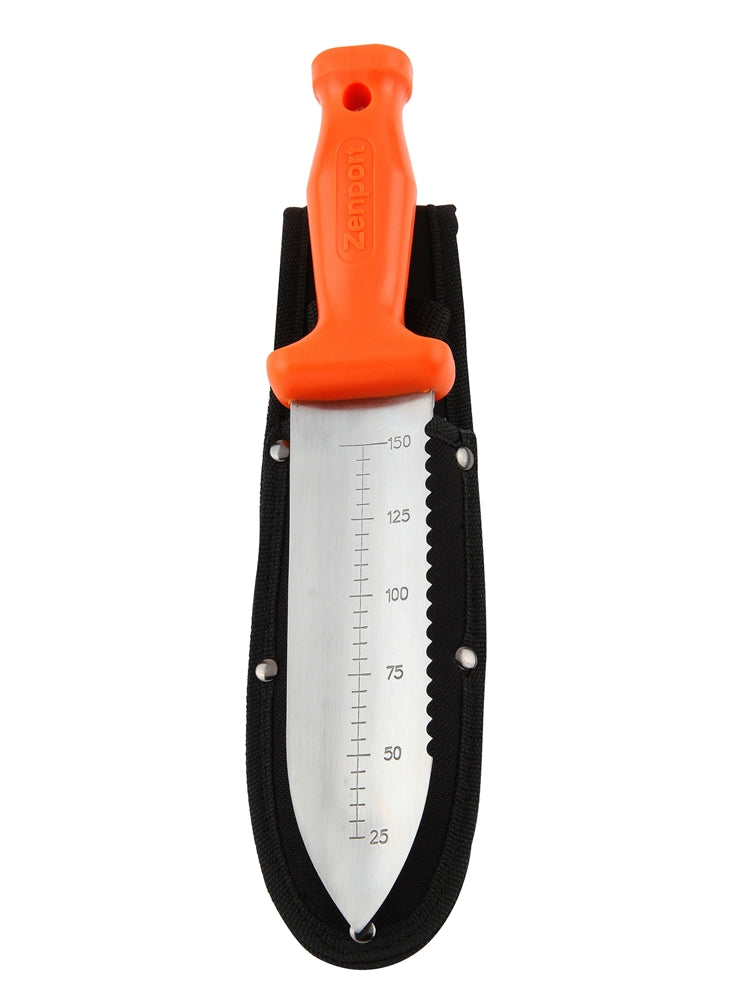 This Zenport K246 ZenBori soil knife, with a 6-inch stainless steel serrated blade and depth measurement markings functions as a scoop trowel, knife, saw and weeding tool.