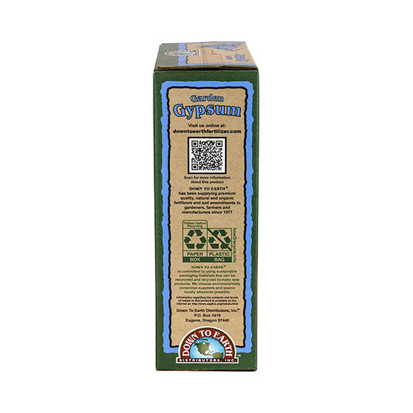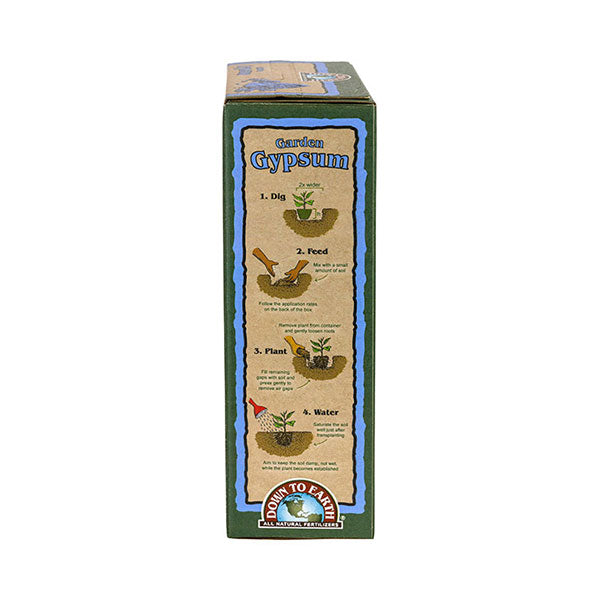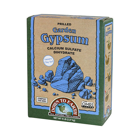 - Down to Earth Garden Gypsum is a five pound box of all natural mineral fertilizer and is listed by the Organic Materials Review Institute (OMRI) for use in organic production