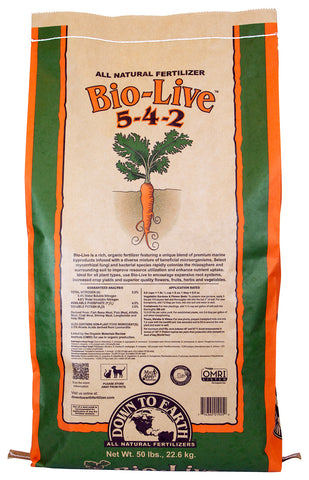 Down To Earth’s Bio-Live 5-4-2 is a rich, organic fertilizer featuring a unique blend of premium marine byproducts infused with a diverse mixture of beneficial microorganisms that improve resource utilization and enhance nutrient uptake. Select mycorrhizal fungi and bacterial species rapidly colonize the rhizosphere and surrounding soil. Ideal for all plant types, use DTE Bio-Live 5-4-2 to encourage expansive root systems, increased crop yields and superior quality flowers, fruits, herbs and vegetables.