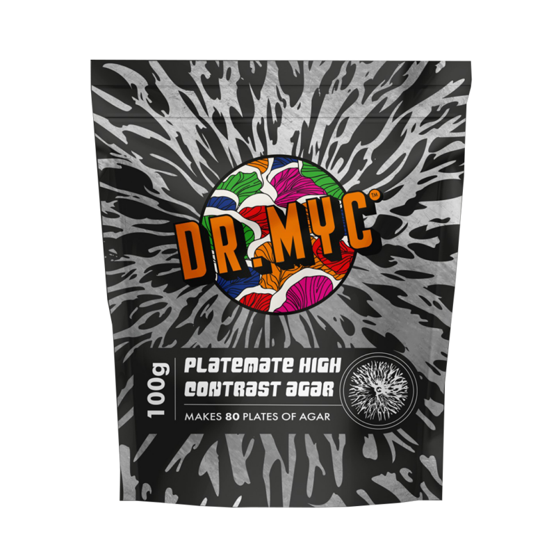 Dr. Myc’s Laboratory Grade PLATEMATE HIGH-CONTRAST AGAR is the easiest way to start making your own agar and culture plates for mycology. Fortified with biochar and carbon sources, Platemate Agar has a natural black color for easy identification of white mycelium and provides the perfect amount of nutrition sources for strong, rapid growth. Each 100g bag makes approximately 80 agar plates – just measure and mix and you’re ready to start!