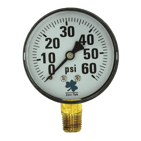 Zenport DPG60 Zen-Tek Instruments 0-60 psi dry air pressure gauge is constructed of a 2.5-inch diameter ABS case with 372 plastic window, 1/4 NPT brass bottom connection and brass internal mechanism. This quality gauge features grade A accuracy (1.6%) and features a high visibility dial and number readout.