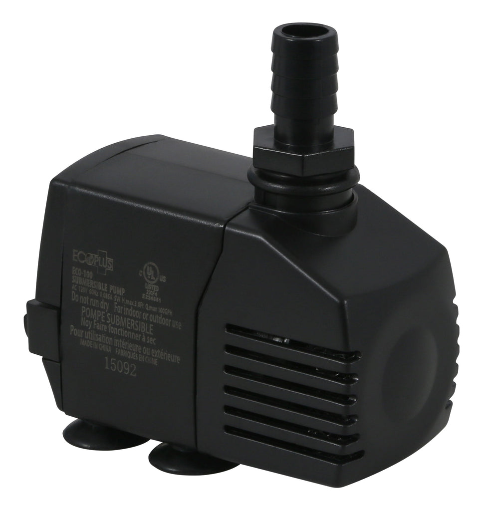 EcoPlus® Fixed Flow Rate Submersible or Inline pumps are great for a variety of application including hydroponics, aquariums, ponds and more. These magnetic driven pumps are constructed with a high quality rare earth rotor magnet which helps deliver an efficient, powerful and constant water flow. Pumps are oil-free and have a ceramic shaft impeller that allows for use in fresh or saltwater applications. Pumps include a variety of attachment fitting to choose from as well as a strainer and foam filter. For use indoors or outdoors. UL listed.