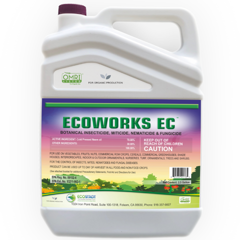 ECOWORKS EC can be used at a rate of 2 tsp (10 ml) per gallon of water for effective control on a wide variety of plants as a foliar application for broad-spectrum pest and disease control. Apply 2-3 treatments for optimal results. For severe infestations, spray every 5-7 days. For preventative purposes, spray every 7-10 days. For recirculatory uses, ECOWORKS EC can be applied by mixing at 2-8 ml per gallon of recirculatory liquid every 7-14 days. For soil drench, ECOWORKS EC can be applied by mixing 2-8 ml per gallon water and applied at one pint (16 oz) of product mixed solution per gallon every 7-14 days for controlling soil-borne pests, nematodes, and diseases.
