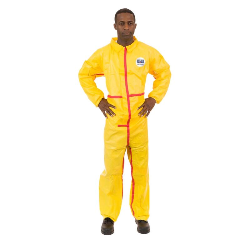 These durable and disposable chemical coveralls protect against chemical splashes and toxic particles. The proprietary, hybrid membrane fabric offers a high moisture vapor transfer rate (MVTR), so you stay cool as you put in a hard day’s work. A storm flap over the zipper with pressure-sensitive tape helps prevent hazardous liquids from seeping through exposed zipper seams. A high contrast red stripe lets you quickly distinguish this taped-seam garment from coveralls made with serged seams. For added comfort, a gusted crotch, elastic back, and seamless shoulders help prevent tears and allow you to move more freely as you work. Elastic wrists and ankles provide a secure closure that helps keep pants and sleeves in place to prevent skin exposure. Possible applications include manufacturing, emergency response, environmental cleanup, and more.