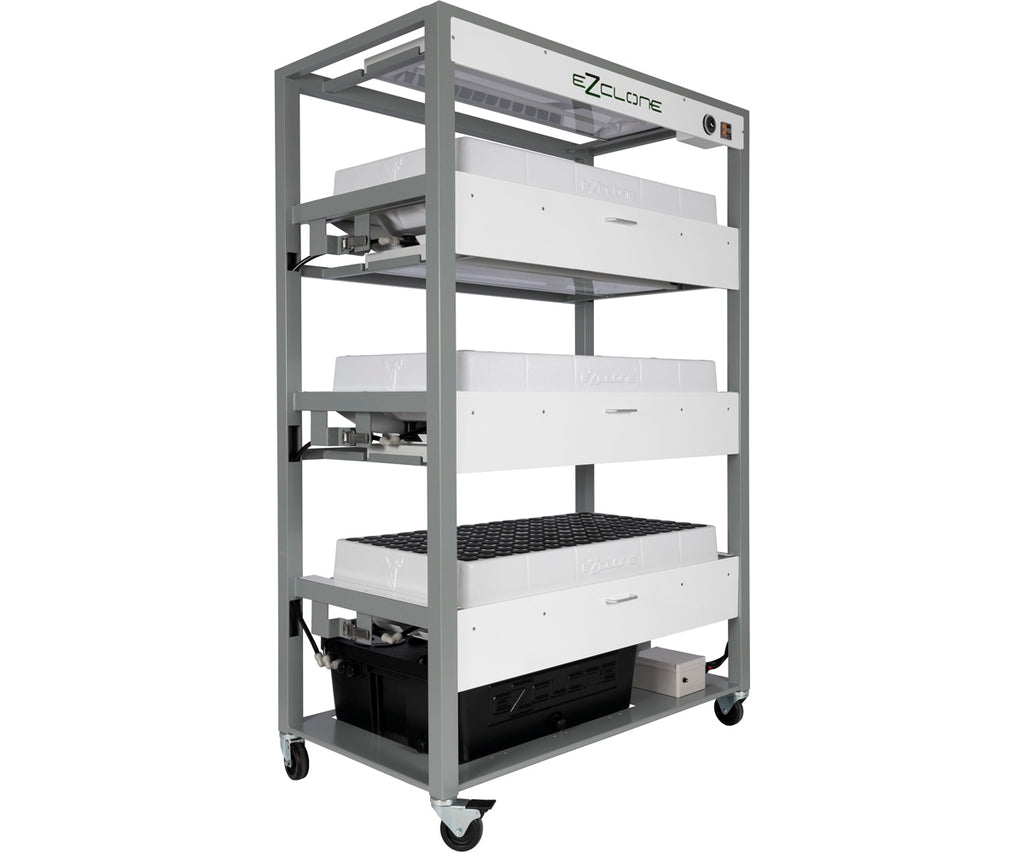 The new EZ-Clone Pro System features 459 cloning sites, and is made from recyclable HDPE, which is chemically resistant and extremely durable. The open-air design eliminates stale air, reducing the risk of mold and biological issues. The EZ-Clone Pro System features pullout trays, a standard 120v outlet, and heavy-duty casters for mobility. With a 2-hour clean up time and estimated $1 per day operational cost, the system is designed to pay for itself in its first cycle.
