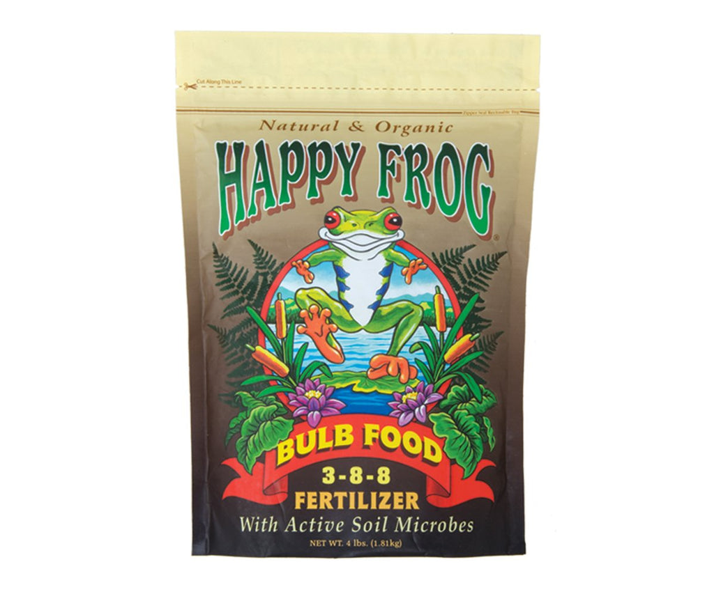 Formulated to encourage long term blooming, this fertilizer contains extra phosphorus for sustained flowering and potassium to help plants become more disease resistant. Happy Frog Bulb Food works great on tulips, daffodils, gladiolas, dahlias, and all flowering plants and trees.