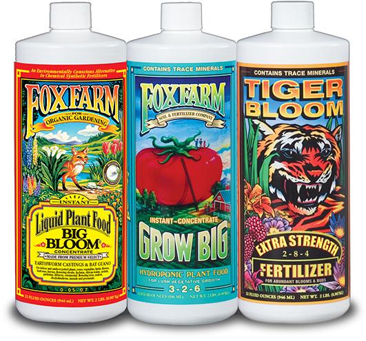 Start with Grow Big Hydro for abundant green growth. Switch to Tiger Bloom at the first sign of bud development. Use Big Bloom throughout all growing cycles to heal root systems and increase nutrient cycling. Ideal for mature, late-season flowers and fruit. Also don’t forget to check out our Light Warrior Agro-Ponic Grow Medium and FoxFarm's high-octane Soluble Granular Fertilizers.