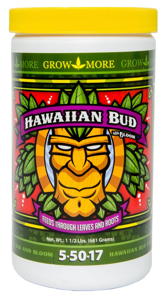 Grow More's Hawaiian Bud is specially formulated to supply phosphate and potash for late flowering cycle. Fortified with six trace elements plus humic acid and Norwegian kelp extract to help produce heavy weight flowers and buds. Correct nutrient ratio to mobilize essential oils and resins for aromatic flowering plants. Developed for use in soilless, hydroponic, organic soils, coco coir and aereoponic system.