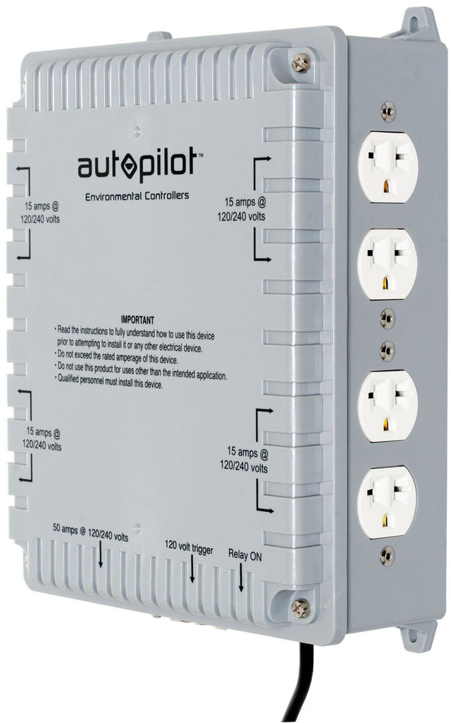 Control multiple lights from one time clock or controller device. Power is wired directly into the four-outlet timer box and all of the outlets are controlled by one 120V trigger cable. Rated for 60 amps at 240 volts. You can plug the trigger cable into a standard 24-hour timer or environmental controller. Three year no hassle warranty.