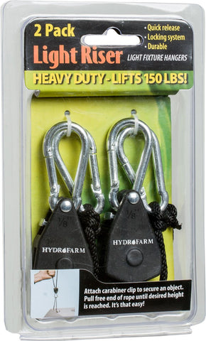 The Light Riser Hanging System makes hanging reflectors, filters or other equipment a snap. Simply secure one of the quick release carabiner clips to a firm location, attach the other clip to the object you want to hang, and then pull the cord until the desired height is reached. It's as simple as that.