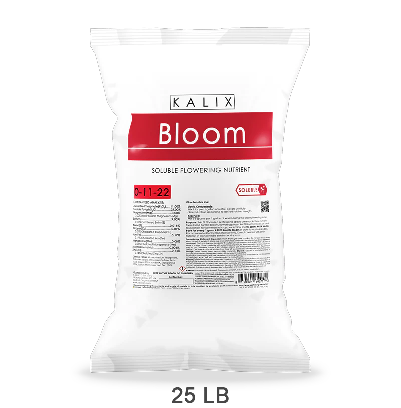 KALIX Bloom is a professional grade commercial base nutrient formulated for the bloom/flowering phase. KALIX Bloom provides an ideal foundation for commercial crop production. Use 0.6 grams KALIX Soluble Base for every 1 gram KALIX Soluble Bloom in order to reach desired EC. Recommended for hydroponic use only. Do not combine with other fertilizers in concentrate solution or dry form.