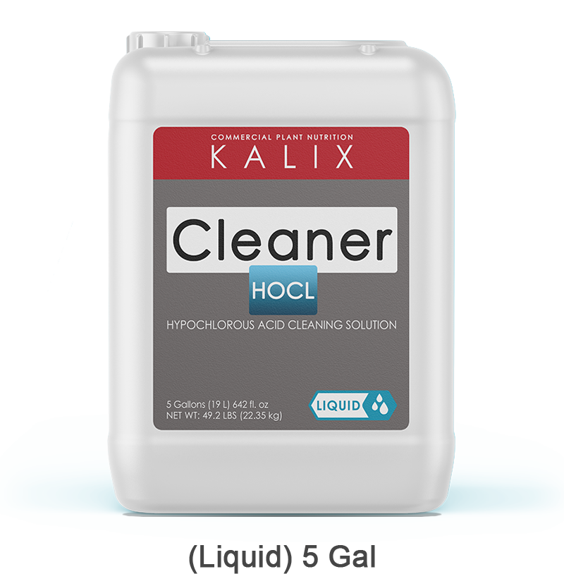 KALIX Cleaner HOCL is made from hypochlorous acid created by a proprietary electrochemical treatment process that yields a non-toxic chemical with powerful oxidative properties. This formulation cleans plant roots by eliminating residual organic matter, and cleans irrigation systems by reducing mineral scale. Also effective as a final flush for removing mineral buildup in irrigation lines and growing media. May be used in all stages of plant growth.