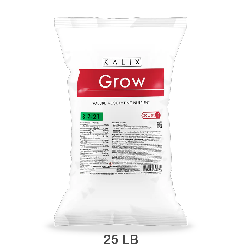 KALIX Grow is a professional grade commercial base nutrient formulated for the grow/vegetative phase. KALIX Grow provides an ideal foundation for commercial crop production. Use 0.6 grams KALIX Soluble Base for every 1 gram KALIX Soluble Grow in order to reach desired EC. Recommended for hydroponic use only. Do not combine with other fertilizers in concentrate solution or dry form.