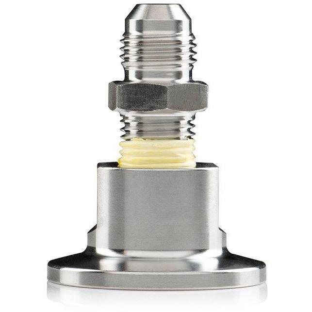 This 304 Stainless Steel KF-25 adapter is fitted with a 304 stainless 37° JIC Flare adapter to connect a vacuum pump or vacuum oven to a stainless steel braided chemical hose or a hvac hose.