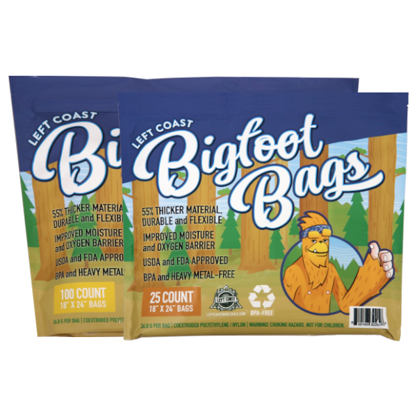 For superior storage of processed product with tear-resistant material, look no further than Bigfoot Bags. 55% thicker than other bags on the market, our industrial-strength nylon polyethylene material results in durable, food-safe, smell-proof bags.