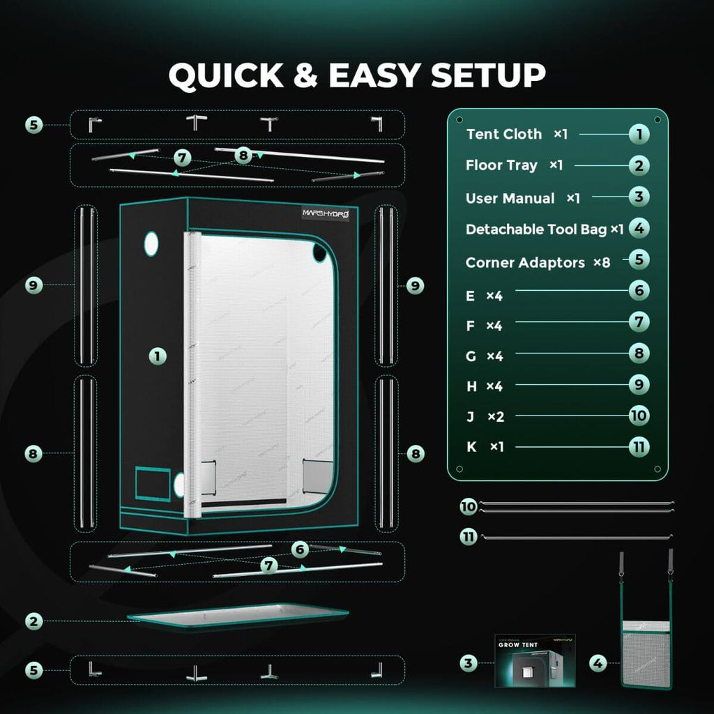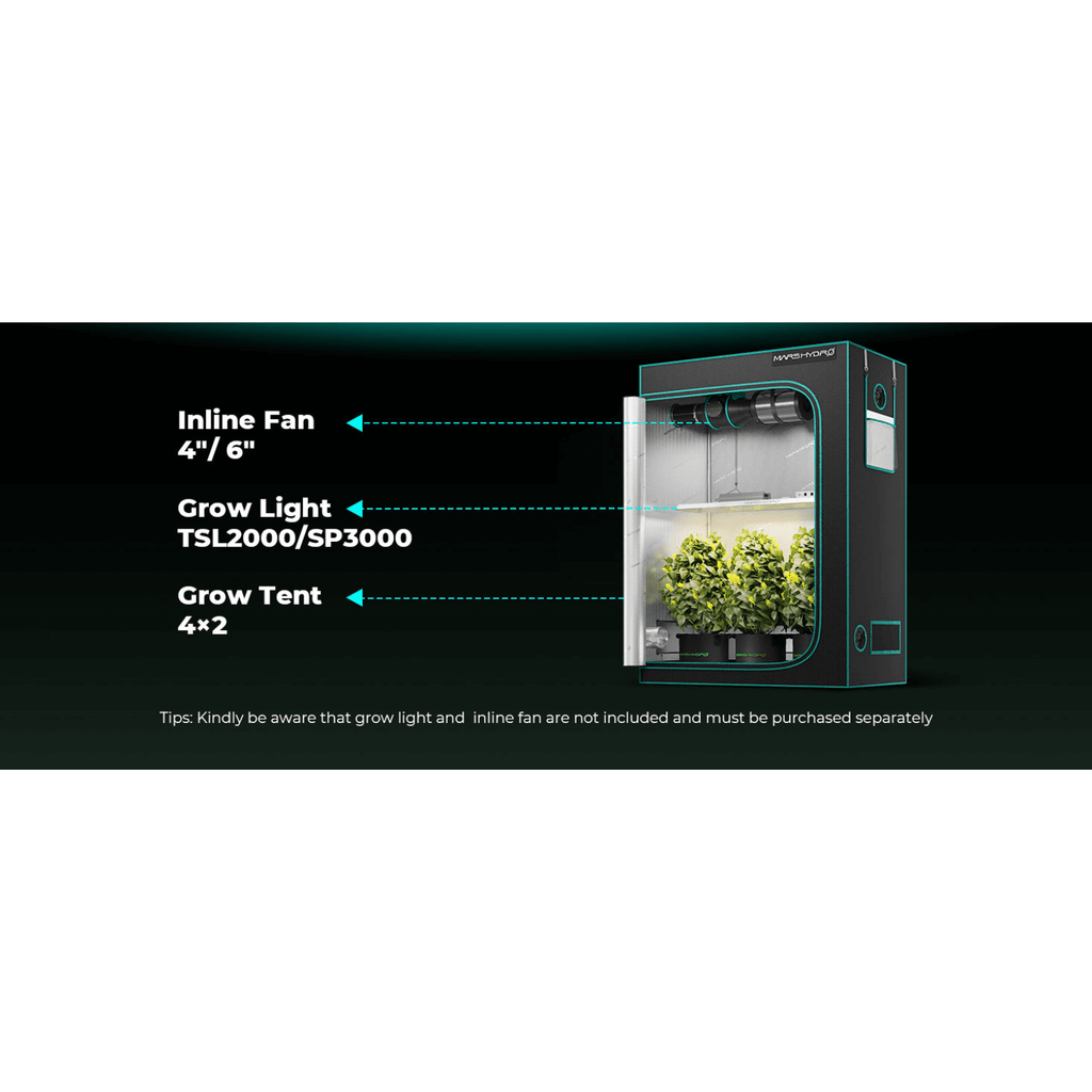 Mars Hydro 48"X24"X71" indoor grow tent uses reflective diamond mylar, tear-proof 1680D canvas, and iron framework to give you a private and reliable cultivating room for 3-6 plants. A complete ventilation system can be included inside for more convenient management of your grow equipment.