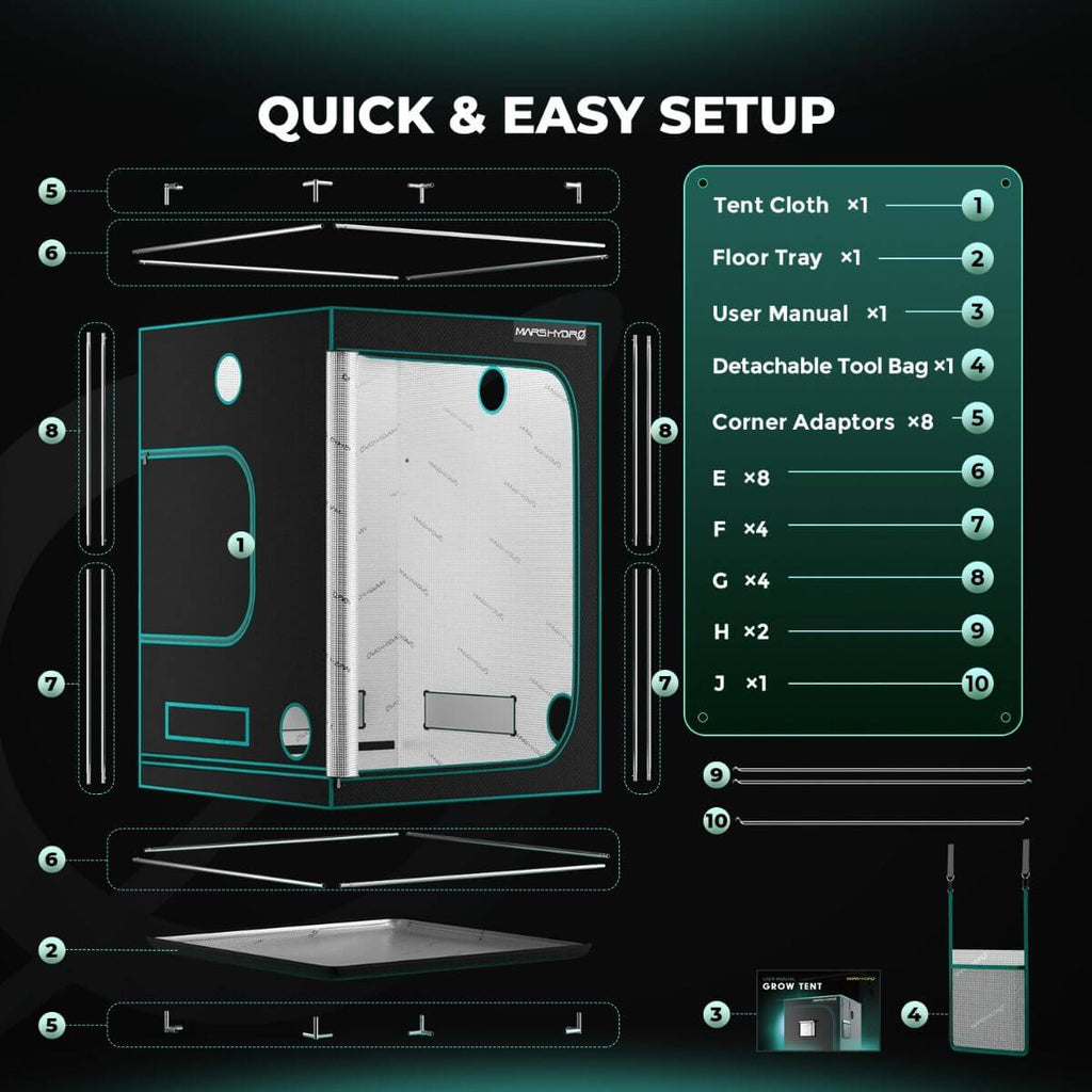 Robust & Stable Indoor Grow Tent: With strong and durable metal corner adapters and poles, this 5x5 grow tent can support up to 154 pounds of grow equipment, ensuring a stable and secure set-up. The poles are coated with a special finish that prevents shaking, rusting, and paint loss, further enhancing the tent's stability and durability.