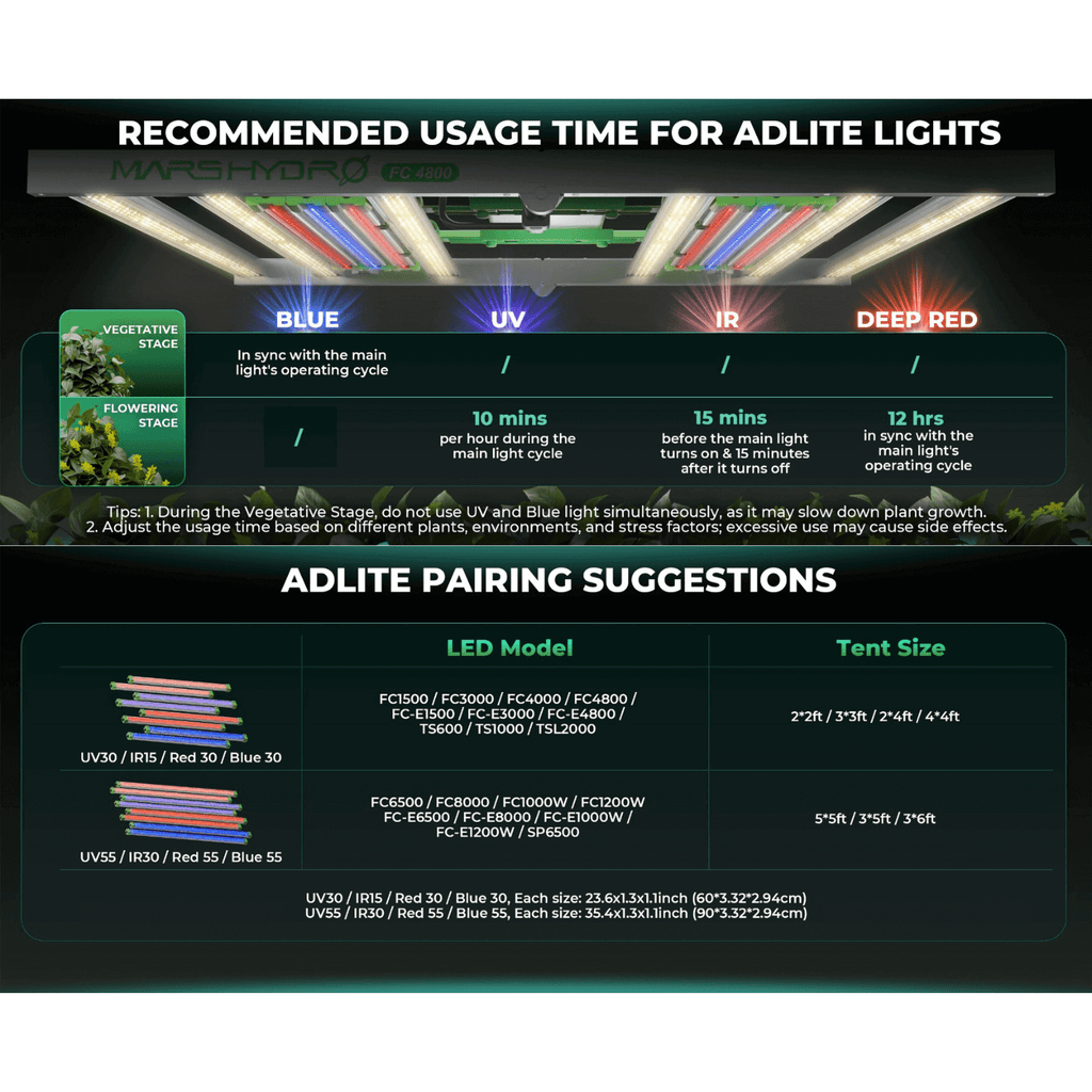 Quick Overview: This product includes ADlite UV 55 and ADlite IR 30. With ADlite UV 55 providing a wavelength of 365-370 nm and having two light bars (27W each), and ADlite IR 30 offering a wavelength of 730-745 nm also with two light bars (15W each). It is suitable for pairing with main grow lights over 500W.