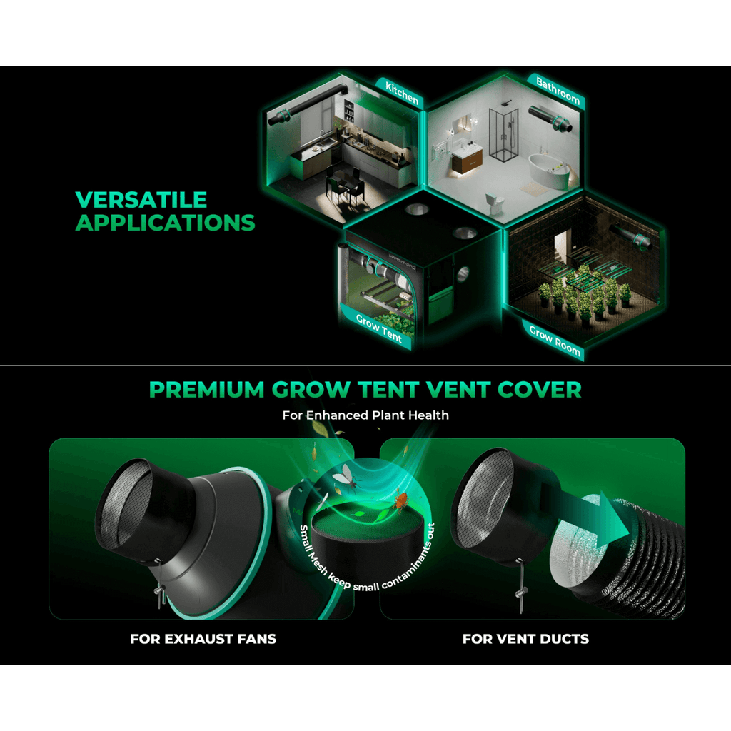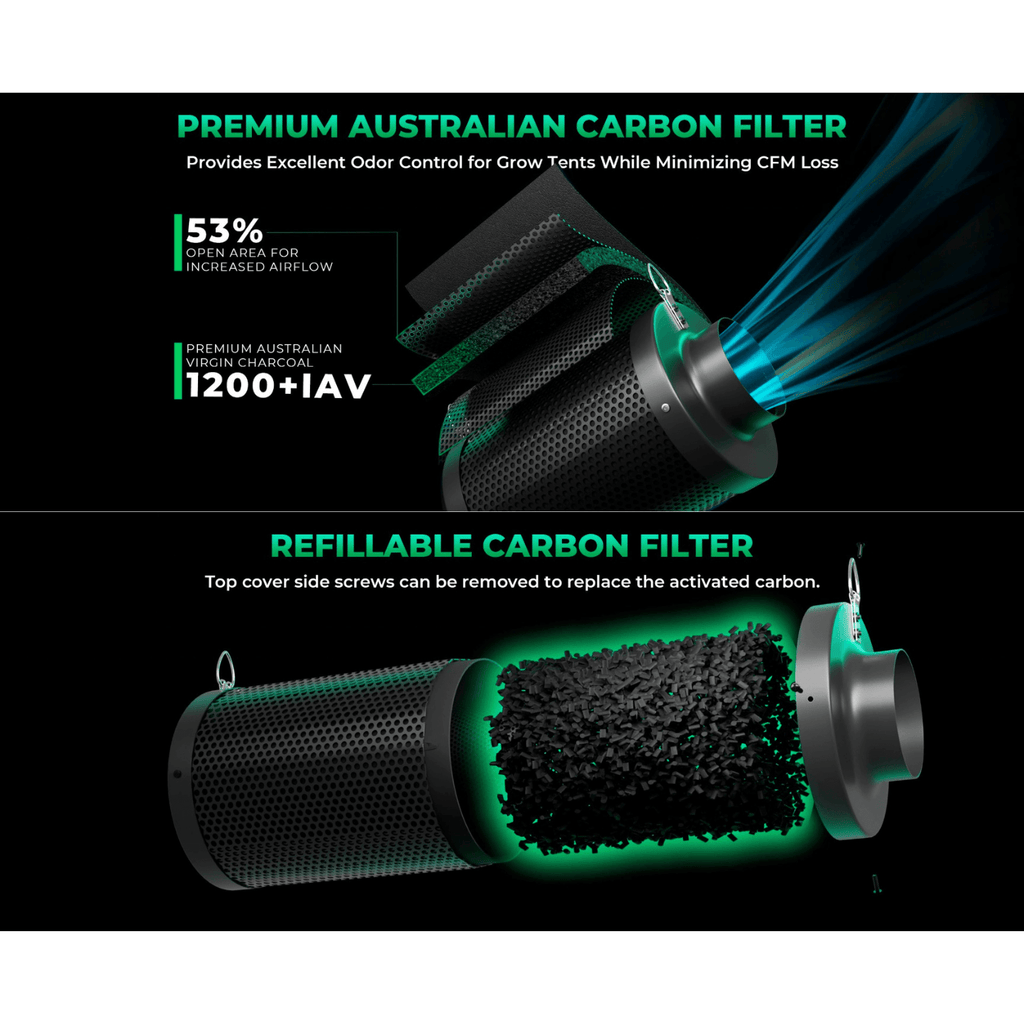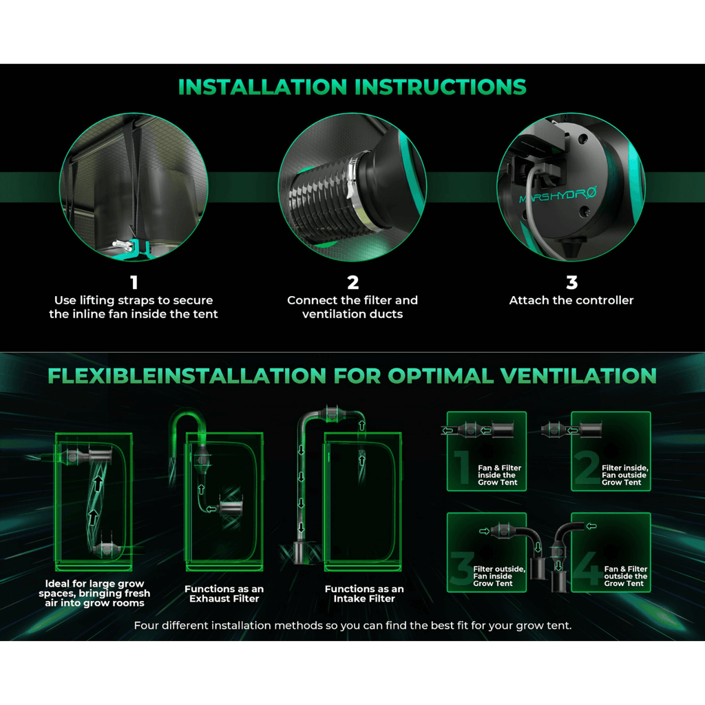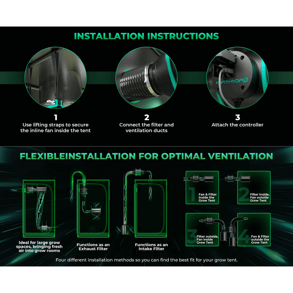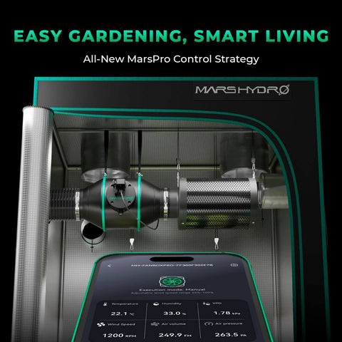 Mars Hydro 4" Smart Ventilation Kit: This kit includes a 4" inline duct fan that can be managed through the app, a high-efficiency charcoal filter, and a ducting system. It provides an intelligent cooling and filtration system for your growing area, maintaining and purifying the airflow and climate.