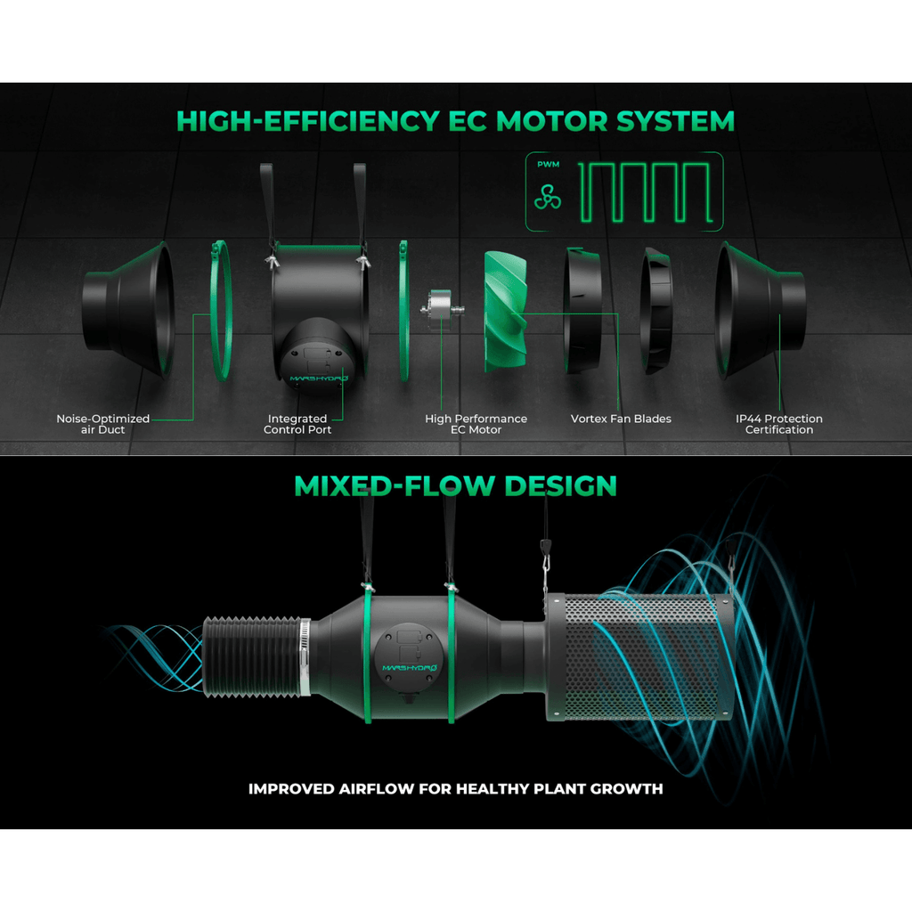 Powerful and Quiet Inline Duct Fan: The Mars Hydro iFresh 4-inch inline fan utilizes a mixed-flow design and a PWM-controlled EC motor, allowing it to generate up to 205 CFM of airflow with minimal noise, suitable for 2x2 feet, 2.3x2.3 feet, and 3x3 feet spaces.