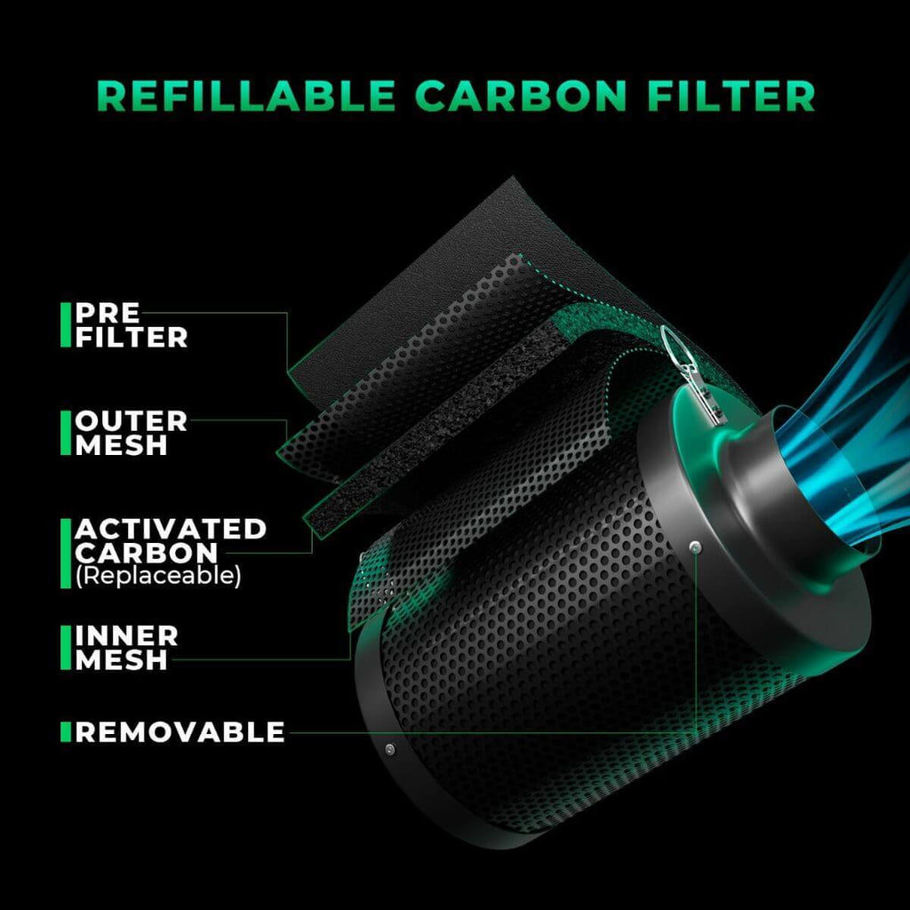 Activated Charcoal Filter: The carbon filter employs activated charcoal to effectively remove odors and particles. Its double-sided steel mesh body has a 53% open area for airflow for thorough odor absorption. The filter includes a pre-filter cloth that should not be removed while in use.