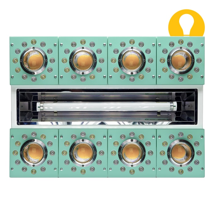 COB or "Chips Of Board" is a new way of building an LED! The LED is mounted to a single substrate and then that substrate is wired to provide energy to the LED chips. Using this technology creates an all new level of efficiency to the way we use LED! Less wires and less solder points ensures a longer life and less room for error! This LED is packed full of features to help you achieve maximum success in your garden! Using eight 3000K COB LEDs surrounded by 32 additional 6500K diodes this fixture provides a balanced full spectrum of light to deeply penetrate the canopy! Equipped with a UVB Bar that you and your plants will love! UVB is a reactive form of light naturally occurring from our sun; when the plants feel this light they know to protect themselves with sweet sticky resin! You could say the plant can make its own sun screen in a way! The MINT LED COB 1000 provides UVA, UVB, and IR to make your plants the best that they can be! Use the remote control to easily change the features on this cool-to-the-touch light and control each individual spectrum to exactly what you need! Settle for leaving your room in nothing but MINT condition! 4.05 AMPS