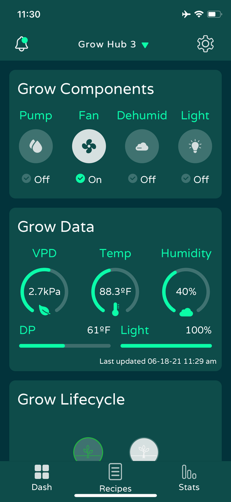 For growers concerned about what’s going on in their garden, any user can check the live status of their garden by glancing at their dashboard or check the ‘stats’ section to view live and historical grow data within their garden. Additionally, growers can create their own custom grow recipe and customize the ideal climate they’re seeking (for different times of the day) and the scheduling (i.e. water, light & fan) needed for their plants.