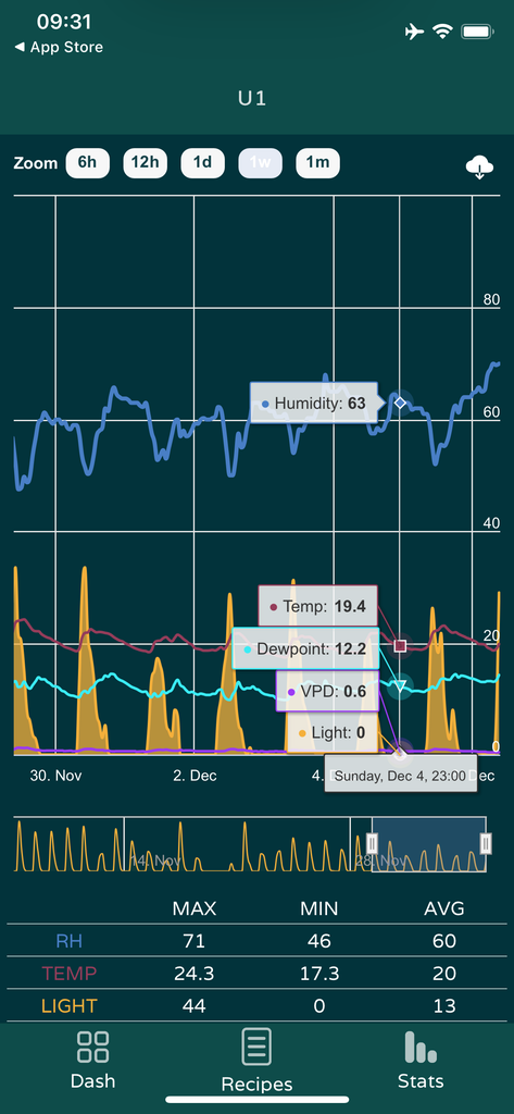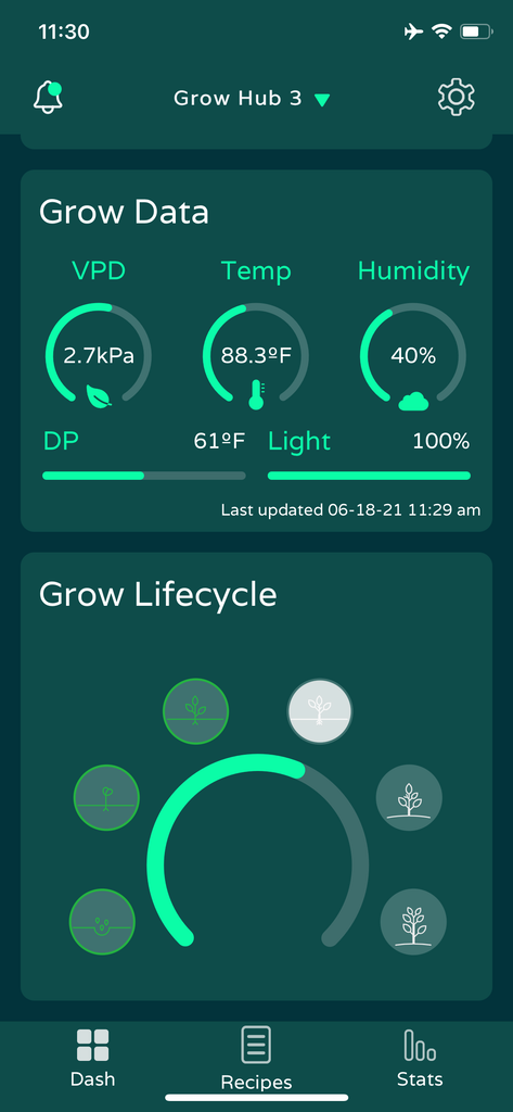 Logging & measuring the different parameters affecting a crops success is fundamental in order to achieve maximum performance. The Grow Hub+ has a built-in datalogger accessible from our app anytime where you can view historical data in the ‘stats’ section and get insight to how your plants are doing and what is affecting them. You can also download the stats you have and have them sent to your email!