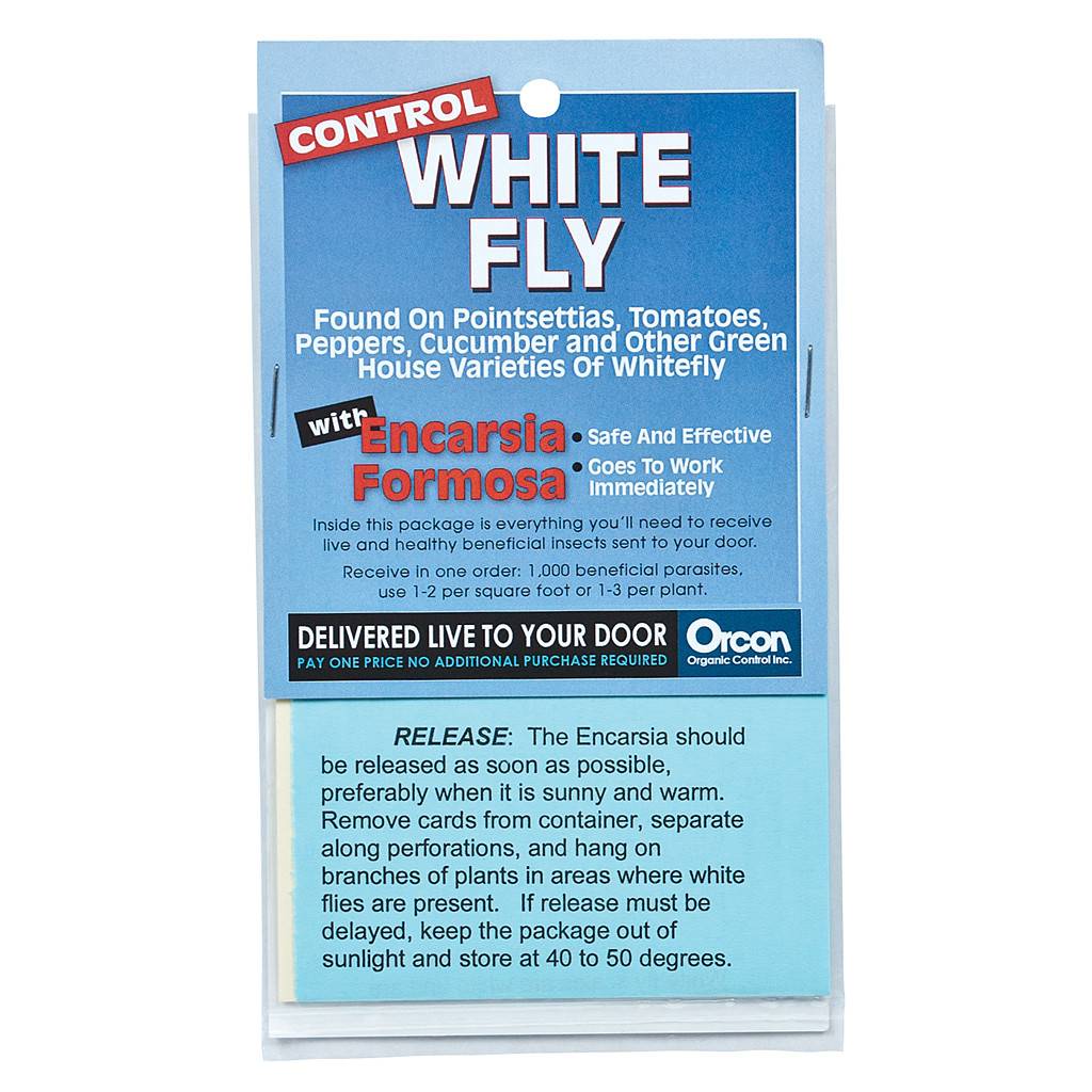The Encarsia formosa is a parasite of the greenhouse whitefly, Trialeurodes vaporariorum, a pest of many plants in indoor and outdoor gardens. Greenhouse whiteflies are typically found on poinsettias, tomatoes, peppers, cucumbers and other plants that grow fairly close to the ground. Each container includes 1,000 eggs. Gardeners simply mail in the postcards or register online to have their insect orders shipped to their doors at no extra cost.
