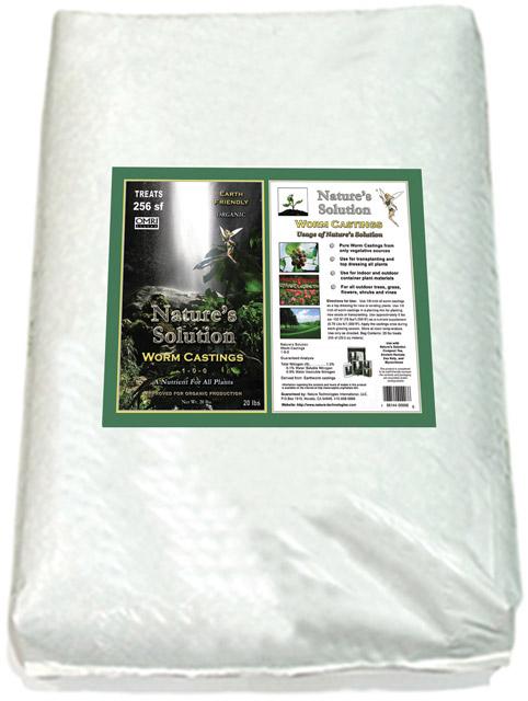 Nature's Solution Worm Castings are a concentrated fertilizer with organic matter for planting, transplanting, and top dressing. Worm Castings aid in uptake of nutrients. Use a 1/8 inch layer as a top dressing around plants. 5 pounds treats 64 square feet. 20 pounds treats 256 square feet. Allowed for organic production.