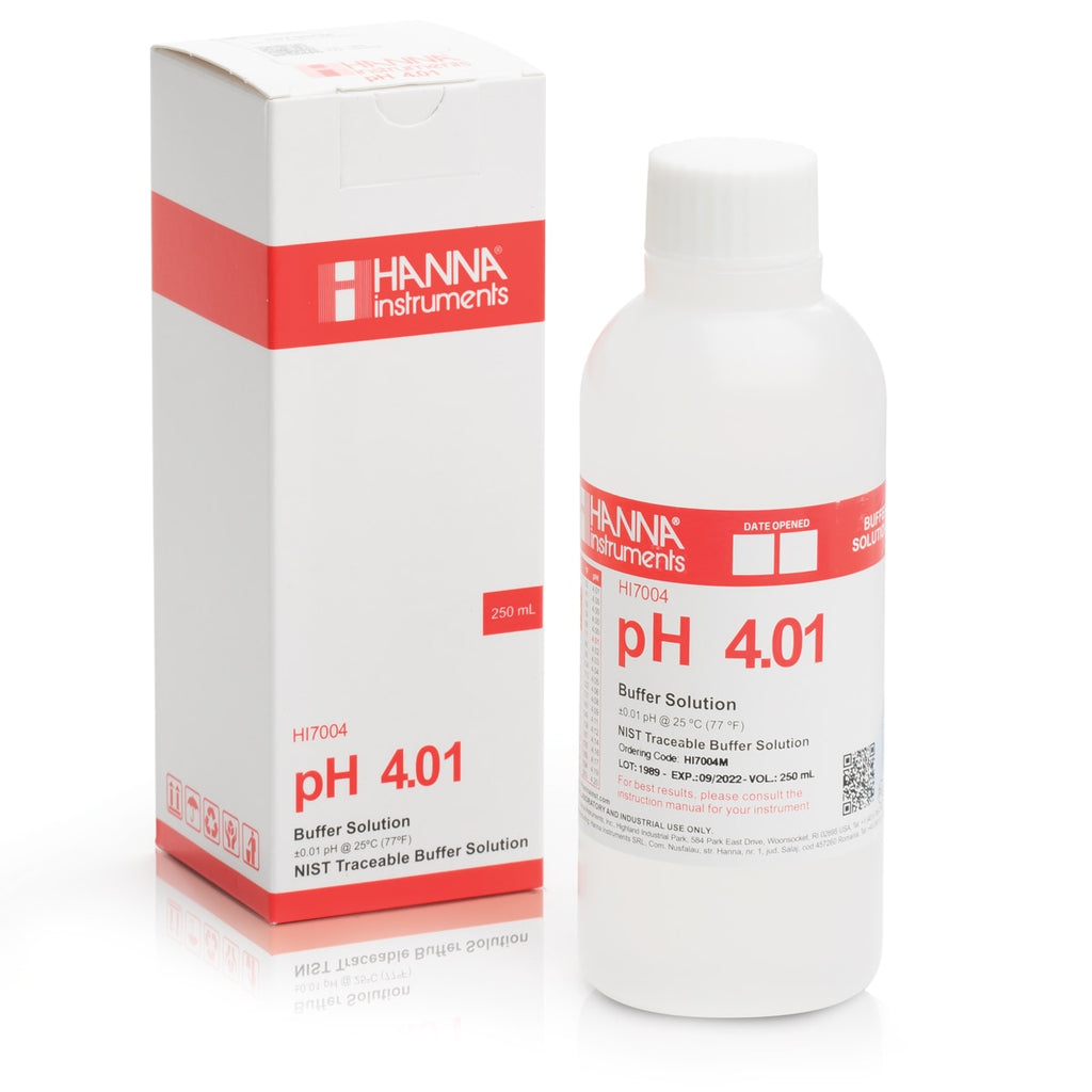 HI7004M is a premium quality pH 4.01 calibration solution. Hanna calibration buffers have the lot number and expiration date clearly marked on the label and are air tight with a tamper-proof seal to ensure the quality of the solution. Hanna's line of calibration buffers have been specially formulated to have an expiration of 5 years from the date of manufacture for an unopened bottle.