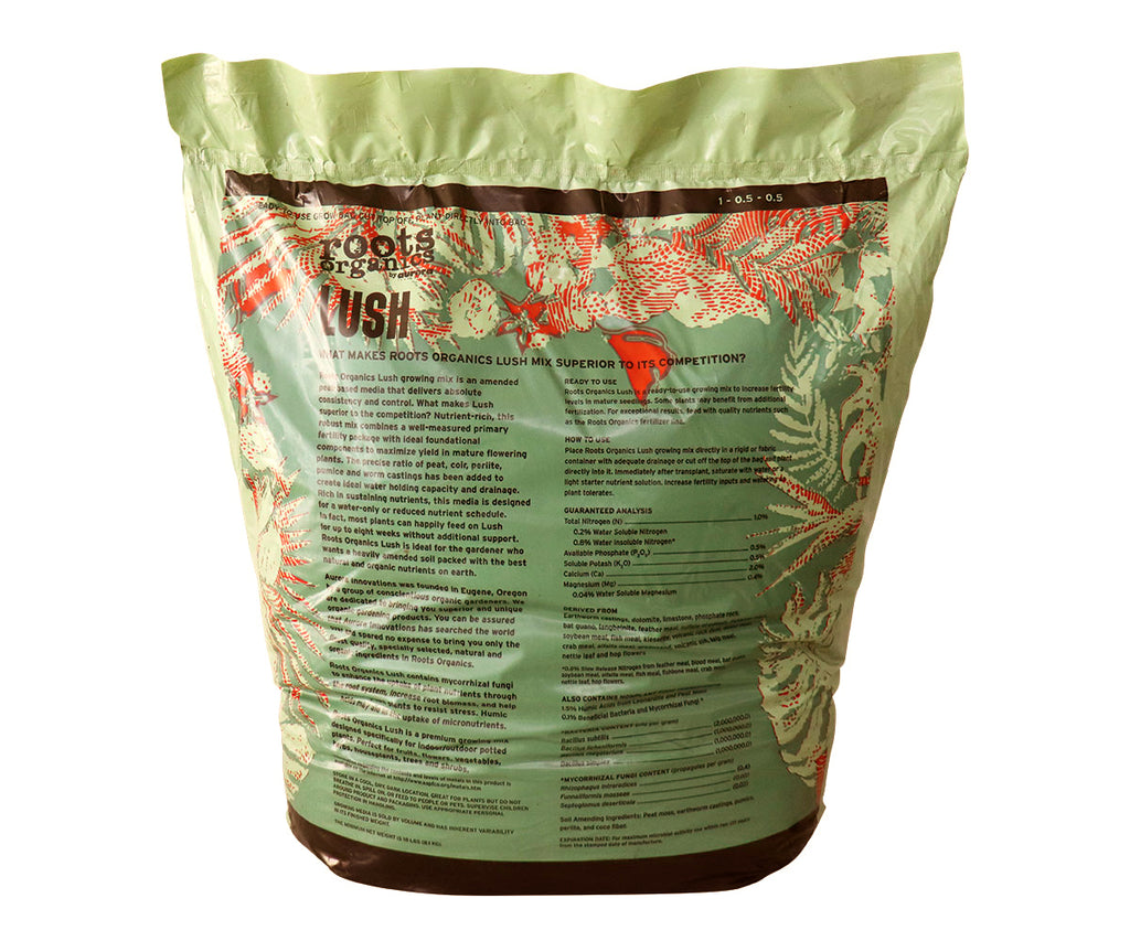 Roots Organics Lush is a ready-to-use growing mix to increase fertility levels in mature seedlings.