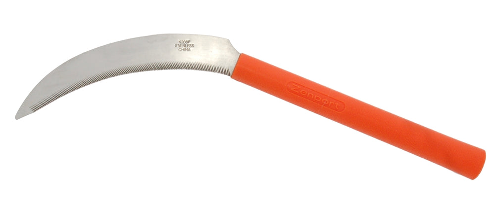 The Zenport K208P Japanese style landscape, weeding and harvesting sickle features a curved 6.5-inch stainless steel blade with deep serrations and a plastic handle.