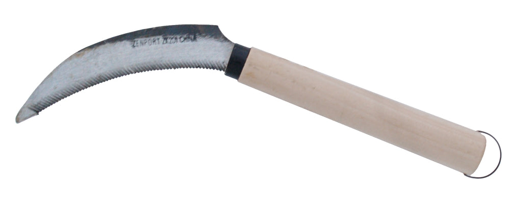 The Zenport K201 harvest and berry sickle/knife with 4.5-inch long curved, serrated edge carbon steel blade and wooden handle is ideal for field crop harvesting, berry harvesting and weeding.