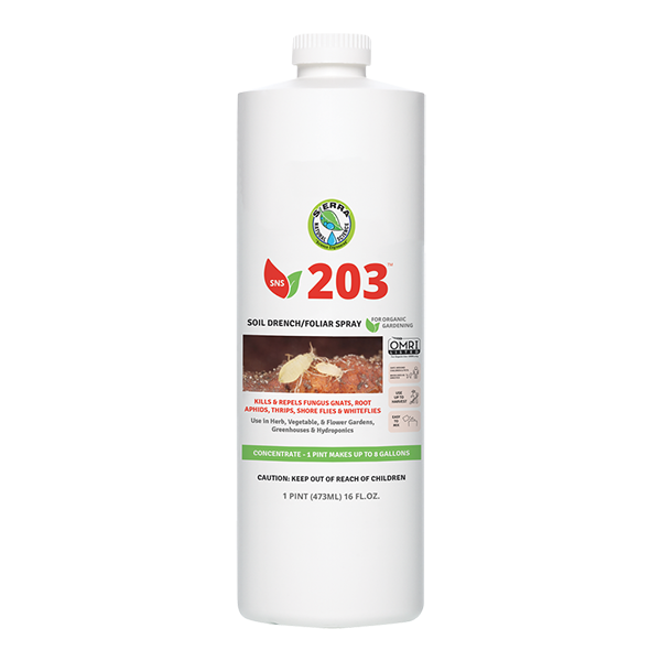 Sierra Natural Science 203 is a foliar spray with active ingredients that dehydrate and kill pests and reduce their available food sources. Safe around kids and pets, this blend kills and repels root aphids, fungus gnats, whiteflies, gnat larvae, thrips, and more.