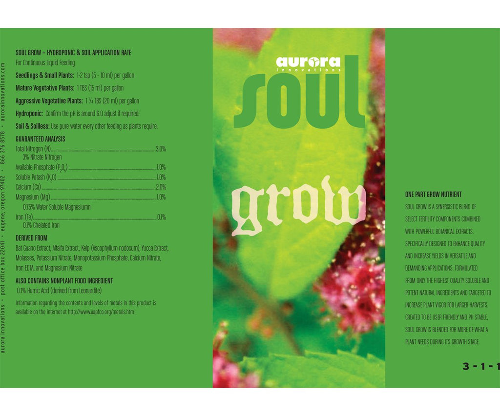 Soul Grow is a blend of highly soluble fertility components enhanced with powerful organic extracts for both maximum yields and spectacular flavor. It was designed specifically for increased yields and enhanced quality in versatile and demanding applications. Formulated from only the highest quality ingredients and targeted to increase plant vigor for larger harvests. Soul Grow is balanced for more of what a plant needs during its vegetative growth stage, and was purposely created to be user friendly and pH stable. Great for both soil and hydroponic gardening.