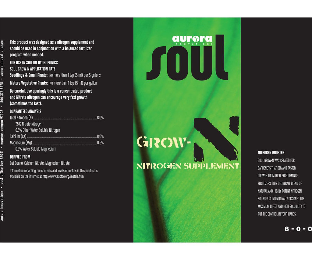 Derived from Bat Guano, Calcium Nitrate and Magnesium Nitrate. Soul Grow-N nitrogen supplement was specifically crafted for the gardener who demands faster growth from high-performance fertilizers. A deliberate blend of fast-acting and natural nitrogen and calcium sources engineered for maximum effect and high solubility. Grow-N puts the controlled application of these essential nutrients in your hands. For exceptional results, combine these highly soluble, fast-acting nutrients with any base nutrient program.
