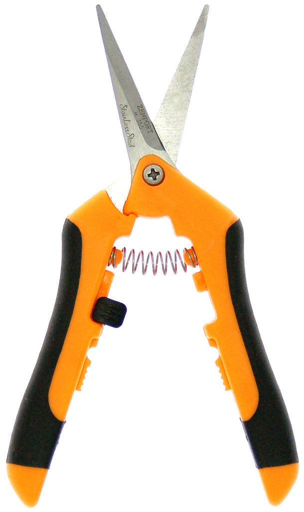 Zenport Shears H355 Stainless Micro-Blade Trimmer, Flower, Weed Trimming Scissors. Micro-Blade Pruners have straight stainless steel blades to prevent rusting and are easy to sterilize. The handles have comfortable rubberized sides that improve gripping power. Overall length is about 6-5/8 inches. The pruning shear tips are narrow so they fit into dense foliage without damaging plants.
