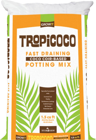 Tropicoco Fast Draining is a premium potting mix made from coconut coir and plenty of perlite, supplemented with natural ingredients. The combination of coir and extra perlite give Tropicoco Fast Draining the advantage of fast drainage, so you can feed your plants more often. Plants’ roots can easily grow and thrive in this loose substrate, which is designed to keep roots aerated. Guanos, worm castings, and other ingredients have been added to complete this high quality growing medium.