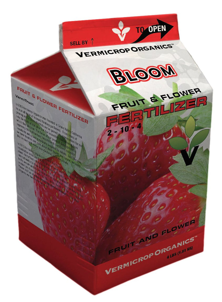 Vermicrop Organics Bloom Dry Fertilizer is produced for all plant types in the fruit and flower stage. It goes to work quickly and has all the essentials to promote prolific blooming and ripening of all fruits, vegetables and flowers. The ultimate blend of natural fertilizers from the sea, earth, and mountains are combined to form an unequaled bloom fertilizer free of fillers. Designed for heavy blooming fruits and flowers, you can attain stellar yields in the easiest way ever imagined for the perfect harvest.