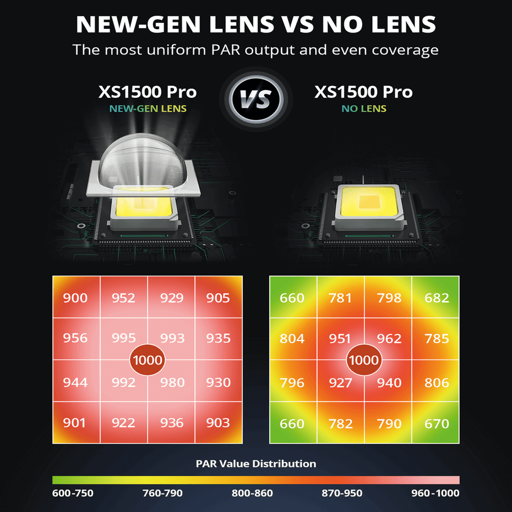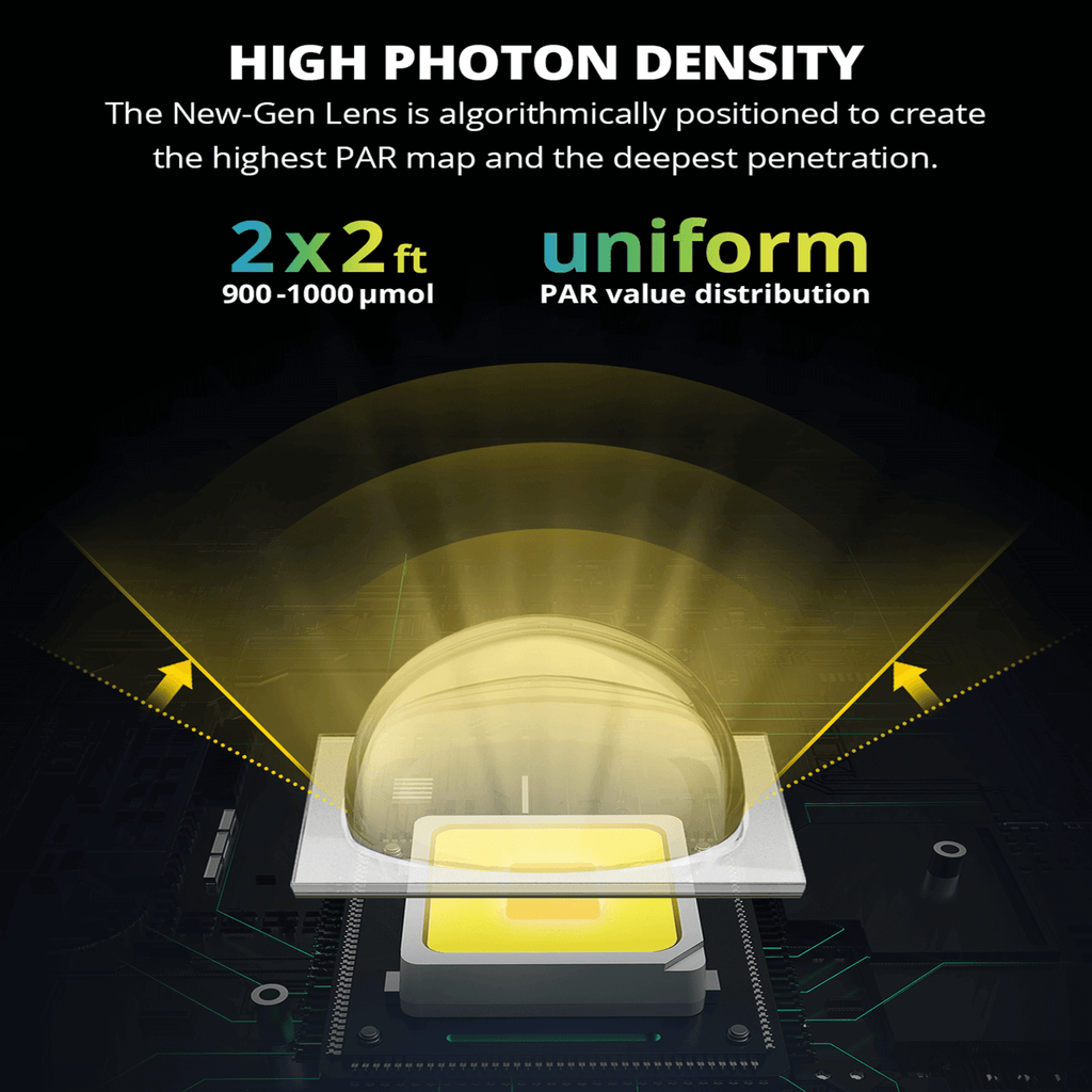 Optical Lenses Design: This design ensures concentrated light and minimal light loss, achieving uniform PPFD for optimal photosynthesis and growth. It ensures that plants absorb balanced PPFD in each corner, leading to balanced growth for healthier plants and higher yields.