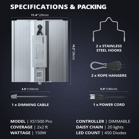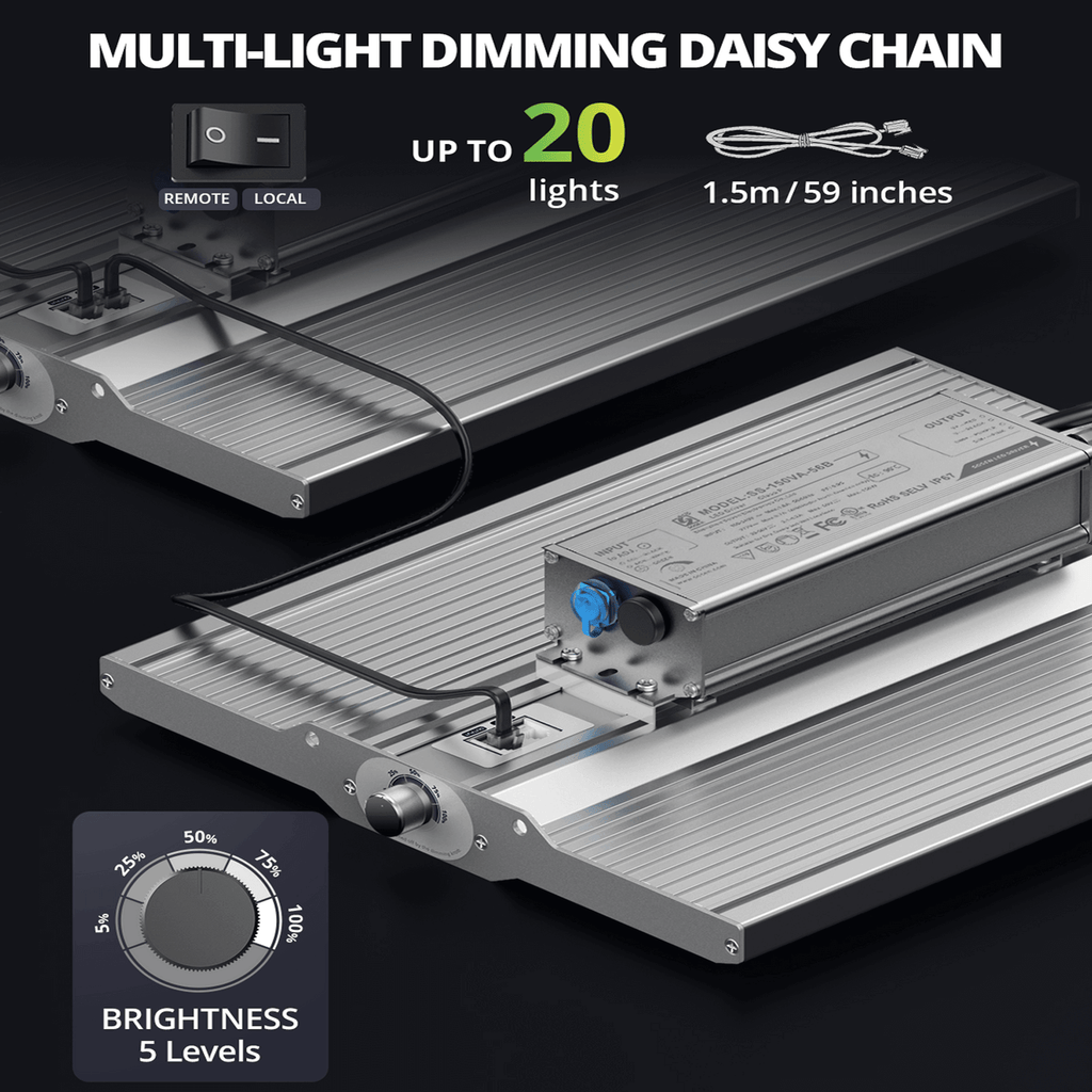 Dimming Daisy Chain: Allows you to connect up to 20 XS1500 Pro units for unified dimming. This feature is particularly useful for commercial growing, horizontal and vertical farming, greenhouse planting, and hydroponics, etc. The external dimmer offers the flexibility to adjust light levels to achieve ideal growth performance at all stages.