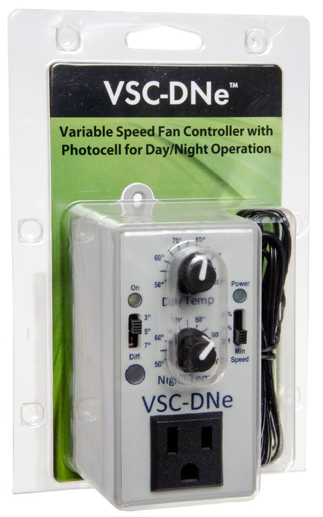 The CAVSC-DNe is designed to gradually increase or decrease the speed of centrifugal fans depending on the day or night temperature set points. The Variable Fan Speed Controller enables you to determine precise temperature levels to achieve within your growing environment by way of proper ventilation. The temperature differential switch can be set at 3°, 5°, or 7°F and comes complete with a 12' probe. The day and night temperature knobs can be set between 50°F and 100°F independently. The built-in photocell will automatically sense day or night and adjust the speed of your fan accordingly. This controller allows you to set the idle speed to 50%, 25%, or no idle. The VSC-DNe is rated up to 350 watts.